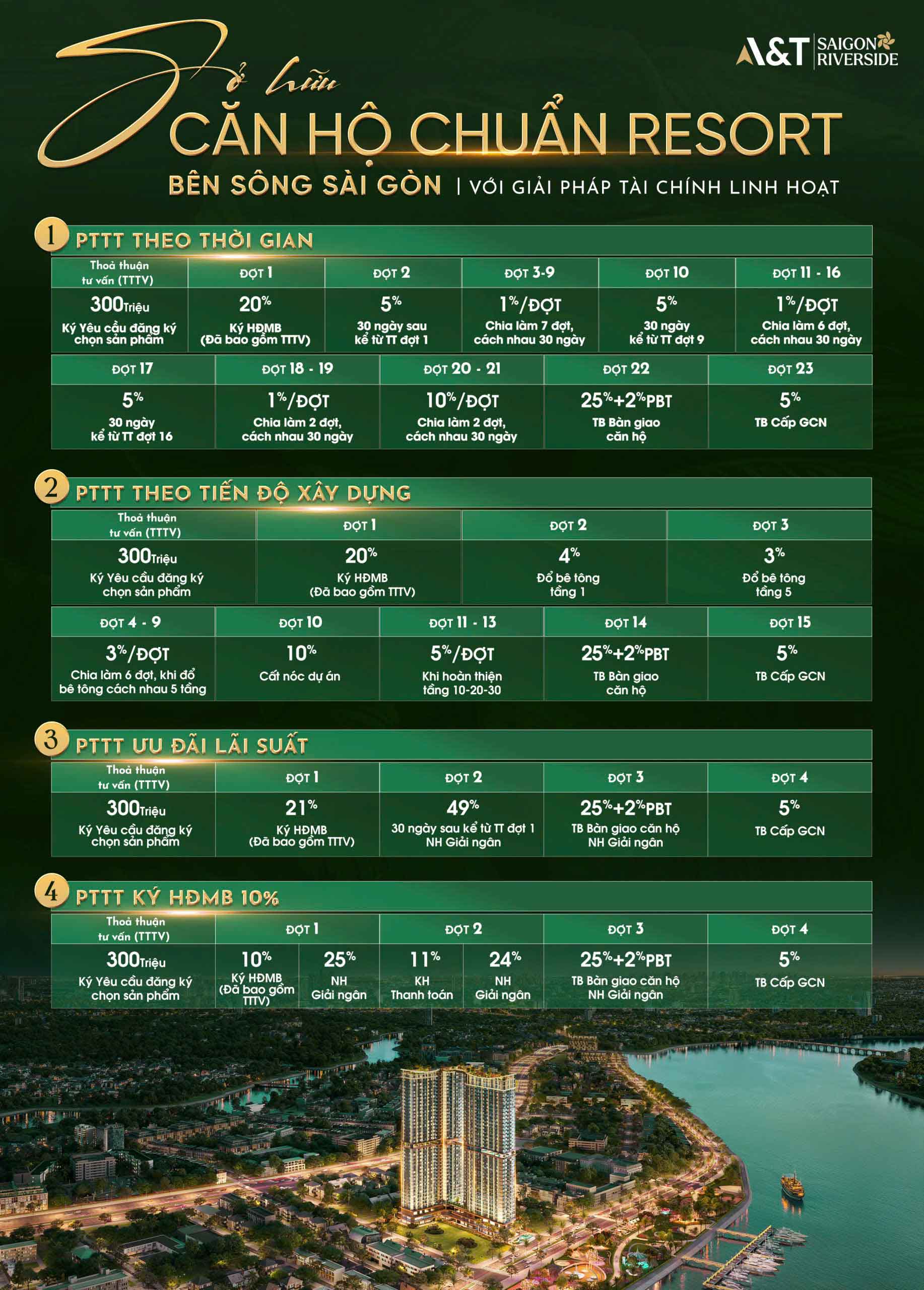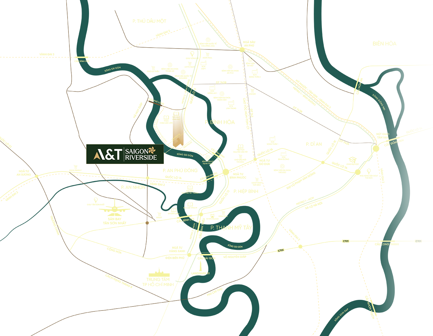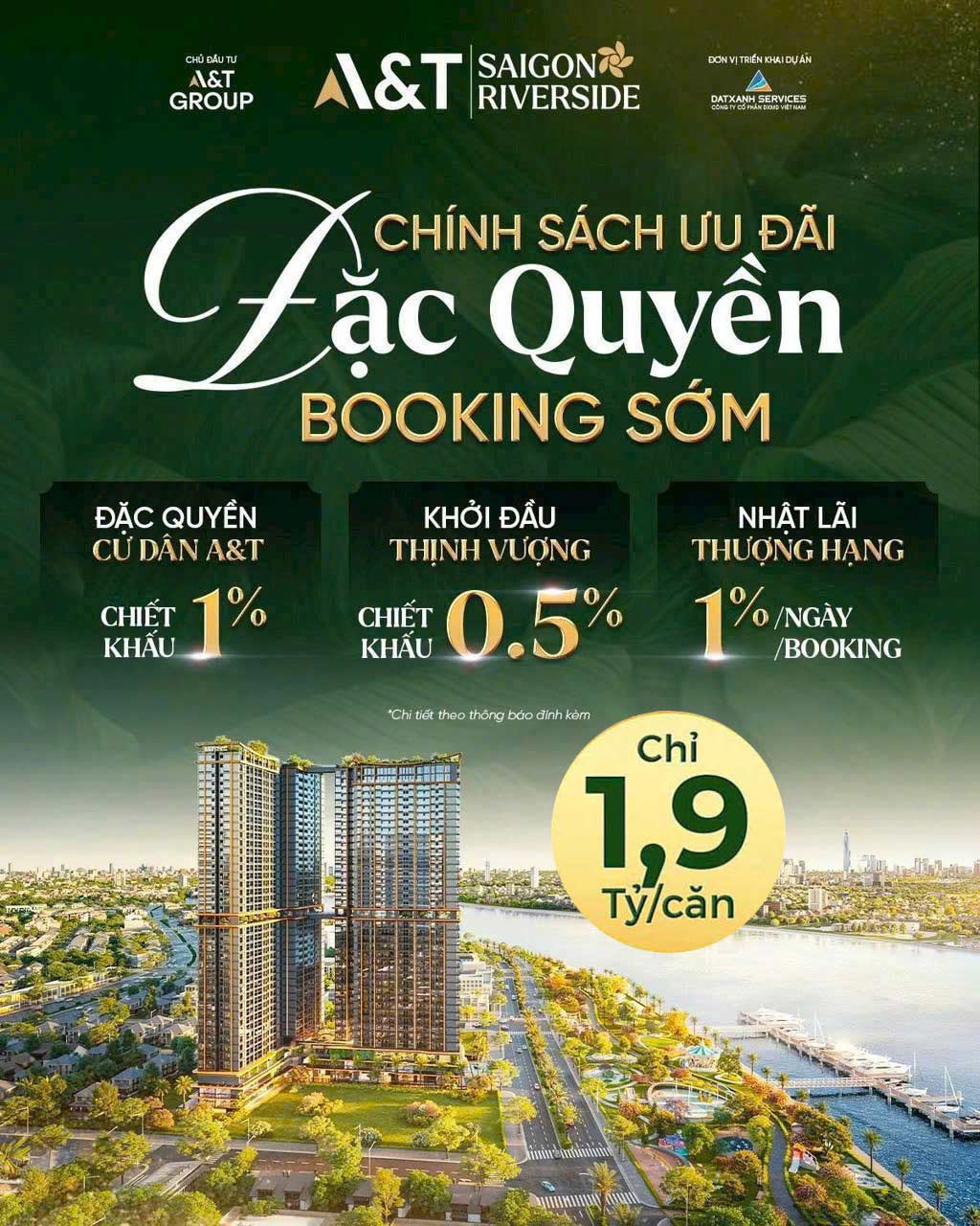 A&T Saigon Riverside là dự án căn hộ cao cấp ven sông Sài Gòn, được phát triển bởi A&T Group – một tập đoàn bất động sản có kinh nghiệm lâu năm tại Việt Nam, với các dự án tiêu biểu như A&T Garden và Kim Tân Golden Place. Dự án nằm tại vị trí đắc địa, mang phong cách sống nghỉ dưỡng (resort-style living), kết hợp hài hòa giữa kiến trúc hiện đại và thiên nhiên, lấy cảm hứng từ các thành phố ven sông nổi tiếng như Paris, London hay Seoul. Đây là dự án thứ hai của A&T Group tại miền Nam, hợp tác chiến lược với DXMD Vietnam, và dự kiến mở bán chính thức vào tháng 10/2025, với hơn 35 đối tác phân phối uy tín tham gia.