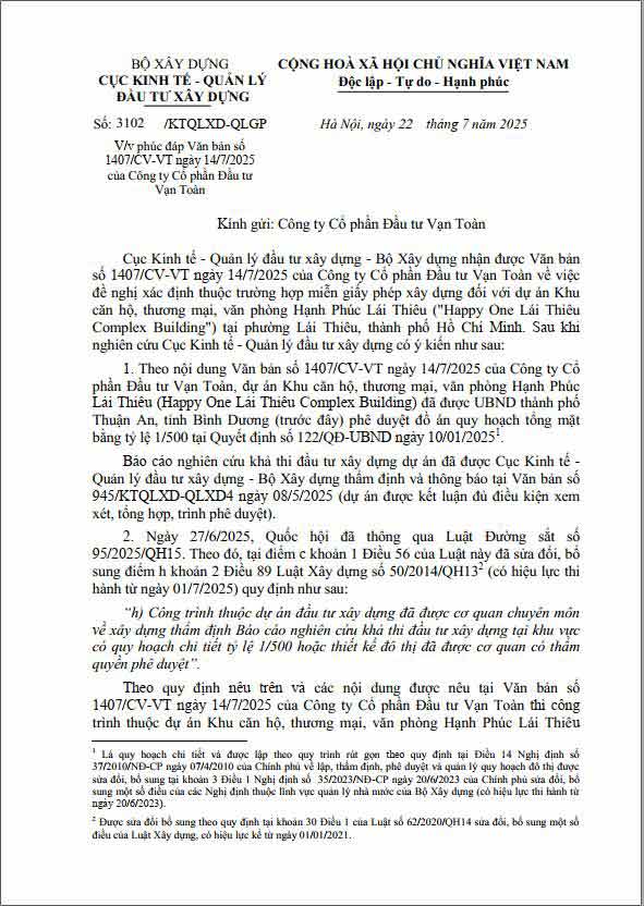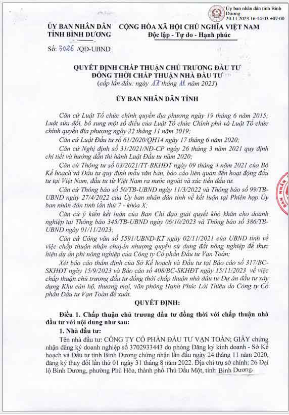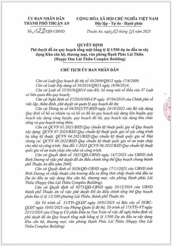 | Giấy phép xây dựng & Quy hoạch | – Đã hoàn tất hồ sơ pháp lý trước mở bán, bao gồm giấy phép xây dựng và quy hoạch 1/500 (tương tự các dự án Happy One trước như Happy One Sora). – Cam kết tuân thủ Quyết định số 15265/QĐ-UBND của UBND tỉnh Bình Dương. |