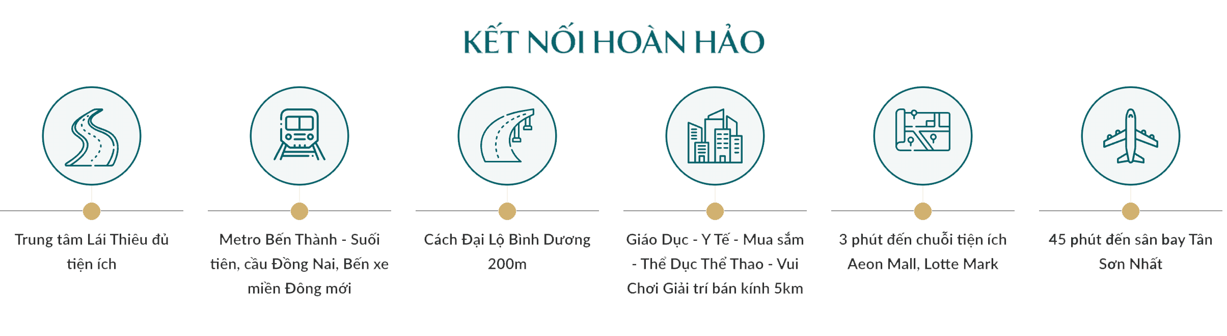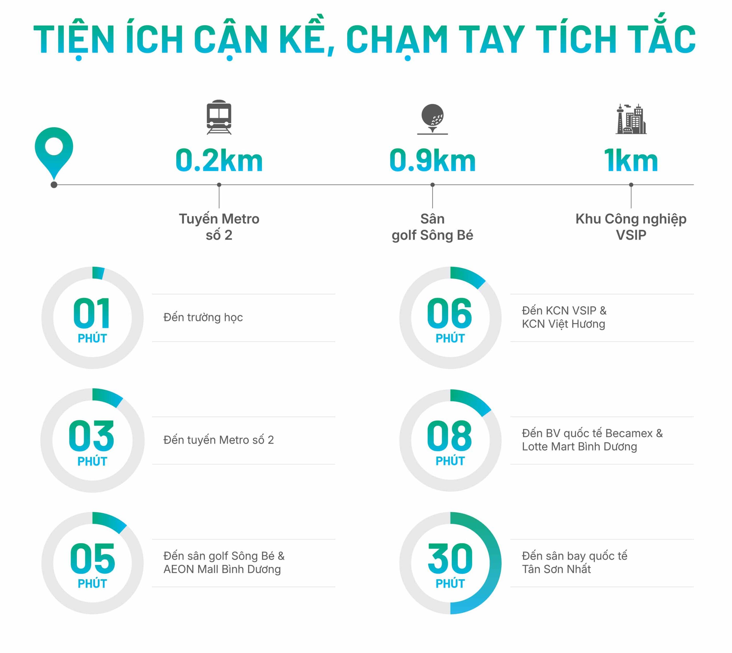 - Từ đây, cư dân dễ dàng kết nối đến trung tâm TP.HCM, hơn 11 khu công nghiệp lân cận (như VSIP 2), sân golf Sông Bé, cũng như các tiện ích ngoại khu như bệnh viện, trường học quốc tế và trung tâm thương mại chỉ trong vài phút.