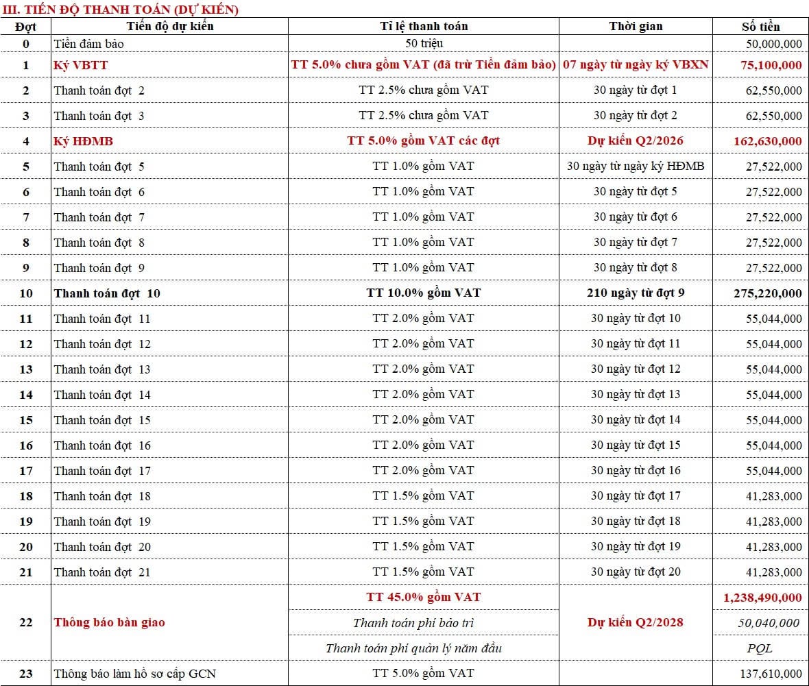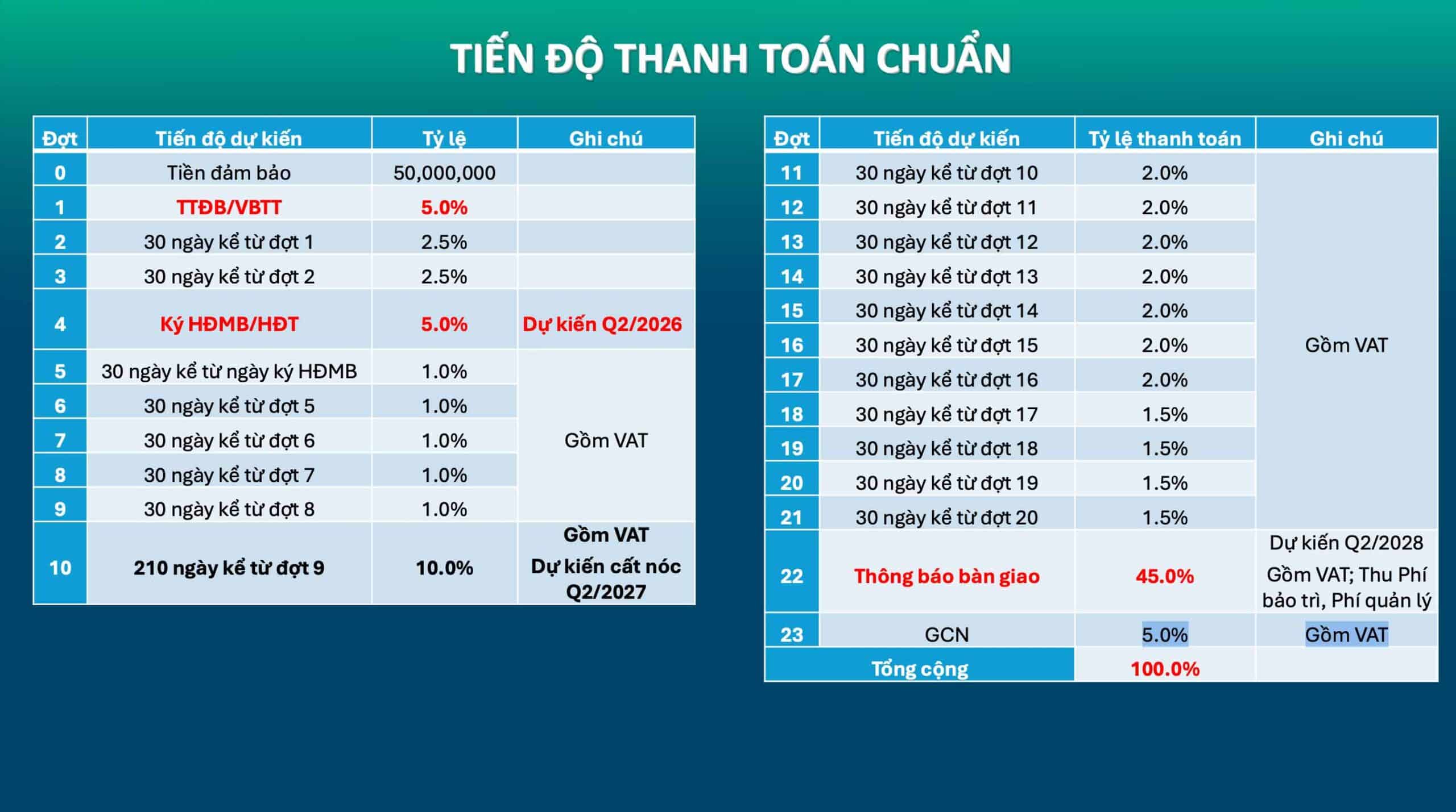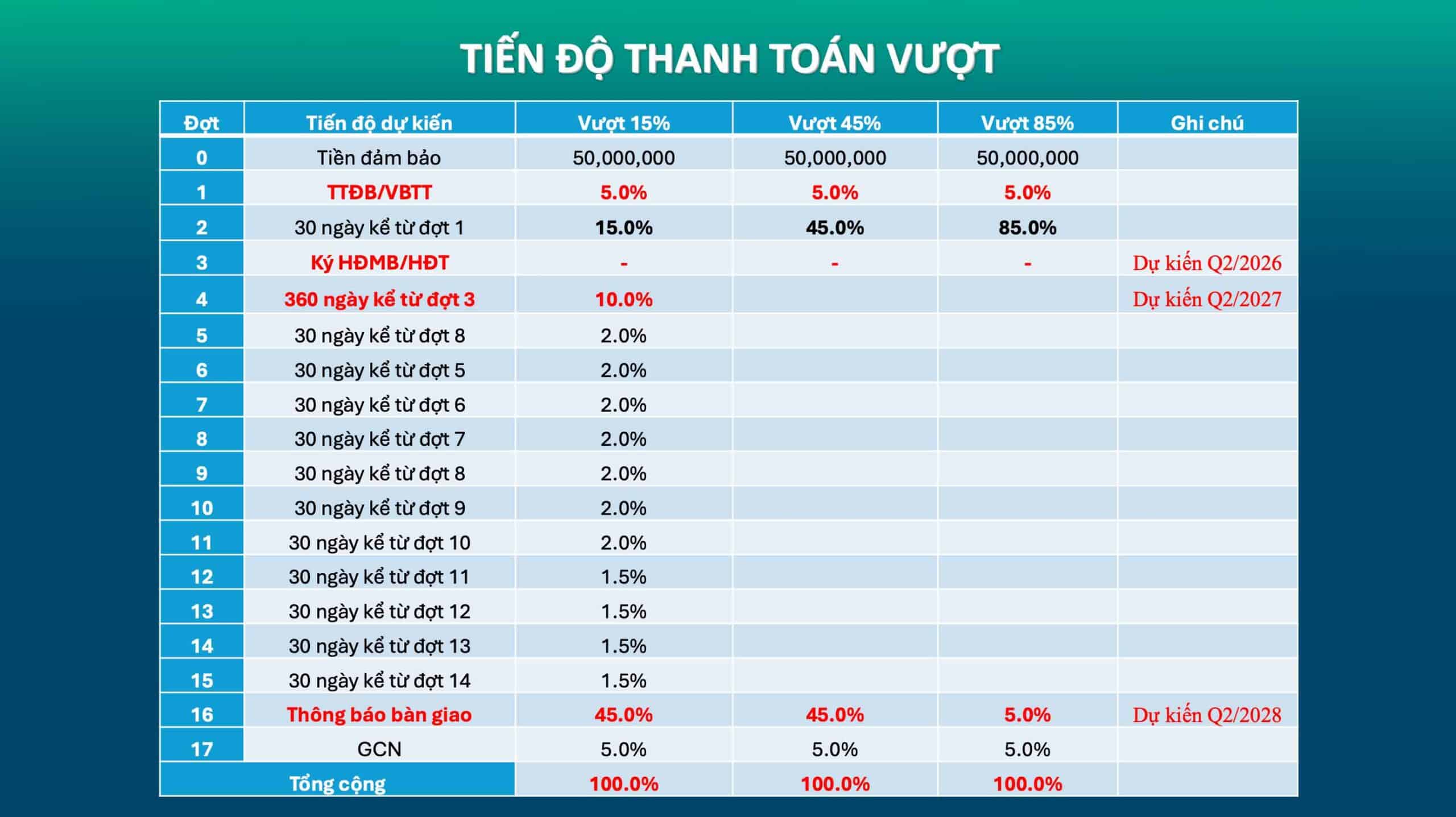 | Hoàn thiện & bàn giao | Q3 – Q4/2027 | Lắp nội thất cao cấp (TOTO, Multi, khóa thông minh), bàn giao từng block. |
