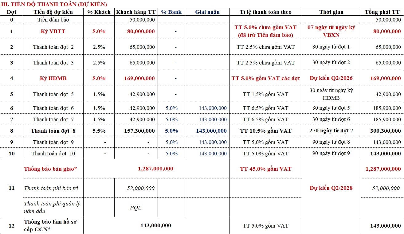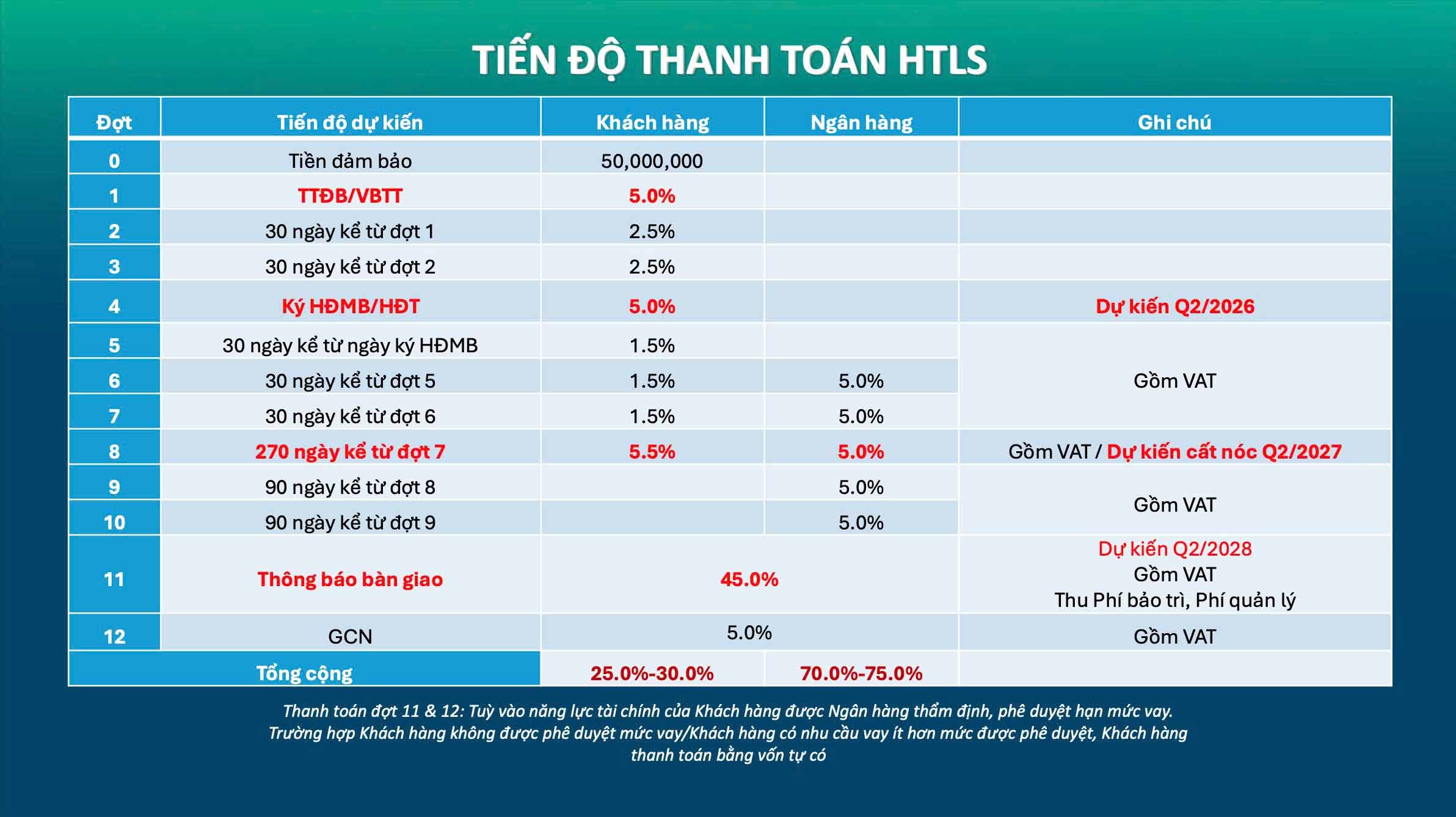 | Bảo lãnh tài chính | – Ngân hàng Quân đội (MB Bank) là đơn vị bảo lãnh và tài trợ vay, với lãi suất cạnh tranh và quy trình thẩm định nhanh chóng. – Đảm bảo tiến độ bàn giao theo hợp đồng. |
